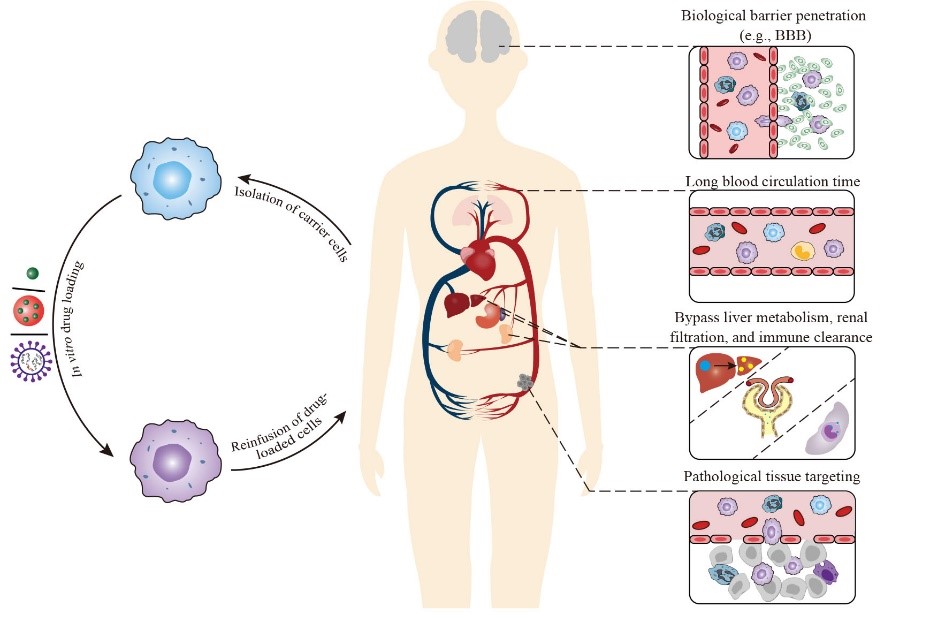 基于细胞的药物递送系统(Cell-based drug delivery systems)是一种利用体内分离获得的活细胞进行药物载荷和体内递送的高度复杂和智能的药物递送系统。由于载体细胞独特的生物学性质和功能,如良好的生物相容性、低免疫原性、长循环时间、(病变)组织归巢特性和生物屏障跨越能力等,该系统在药物体内递送和相关疾病的治疗中显示出巨大的潜力并日益得到重视。目前已有一系列细胞,包括红细胞、干细胞、巨噬细胞、中性粒细胞、T细胞和NK细胞等都被用于包括小分子药物和核酸药物等的载荷、体内递送和相关疾病的治疗。由于受载体细胞本身性质和功能、所载荷药物和载药过程、生理和病理环境以及机体对这些载体细胞的反应等多种因素的影响,这些细胞载体系统在回输体内后具有显著不同的体内命运,并因此导致不同的药物递送效率和疾病治疗效果。本文首先综述了基于细胞的药物递送系统的生物学特性和功能,在药物递送和疾病治疗中的应用,及常用的载药策略和体内示踪技术等;接着着重阐述并分析了各种细胞载体系统的体内命运和影响因素;最后探讨了基于细胞的药物递送系统在后续研发和应用中需要关注的问题及解决思路等。得益于载体细胞自身的生物学性质和功能,并随着载药技术的发展及其体内命运的阐明,基于细胞的药物递送系统有望发展成为(部分已经成为)安全、高效甚至可用于个性化疾病治疗的药物递送(治疗)系统。