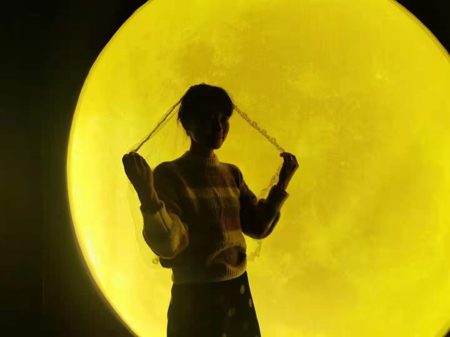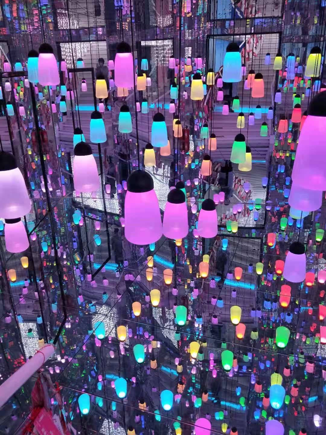 场馆入口处是一个洁白无瑕的空间,在一片白色柔和的灯光下是雪白俊美的独角兽,推开第一个展厅大门,大家就被五彩斑斓的水母吸引,关上房门,黑暗中仿佛置身于无限的深海中。第二个展厅中错落有致地悬挂了缤纷的灯盏,持续变幻着色彩,感叹之余,老师们纷纷用手机记录下了自己在这迷离的幻境中的身影。