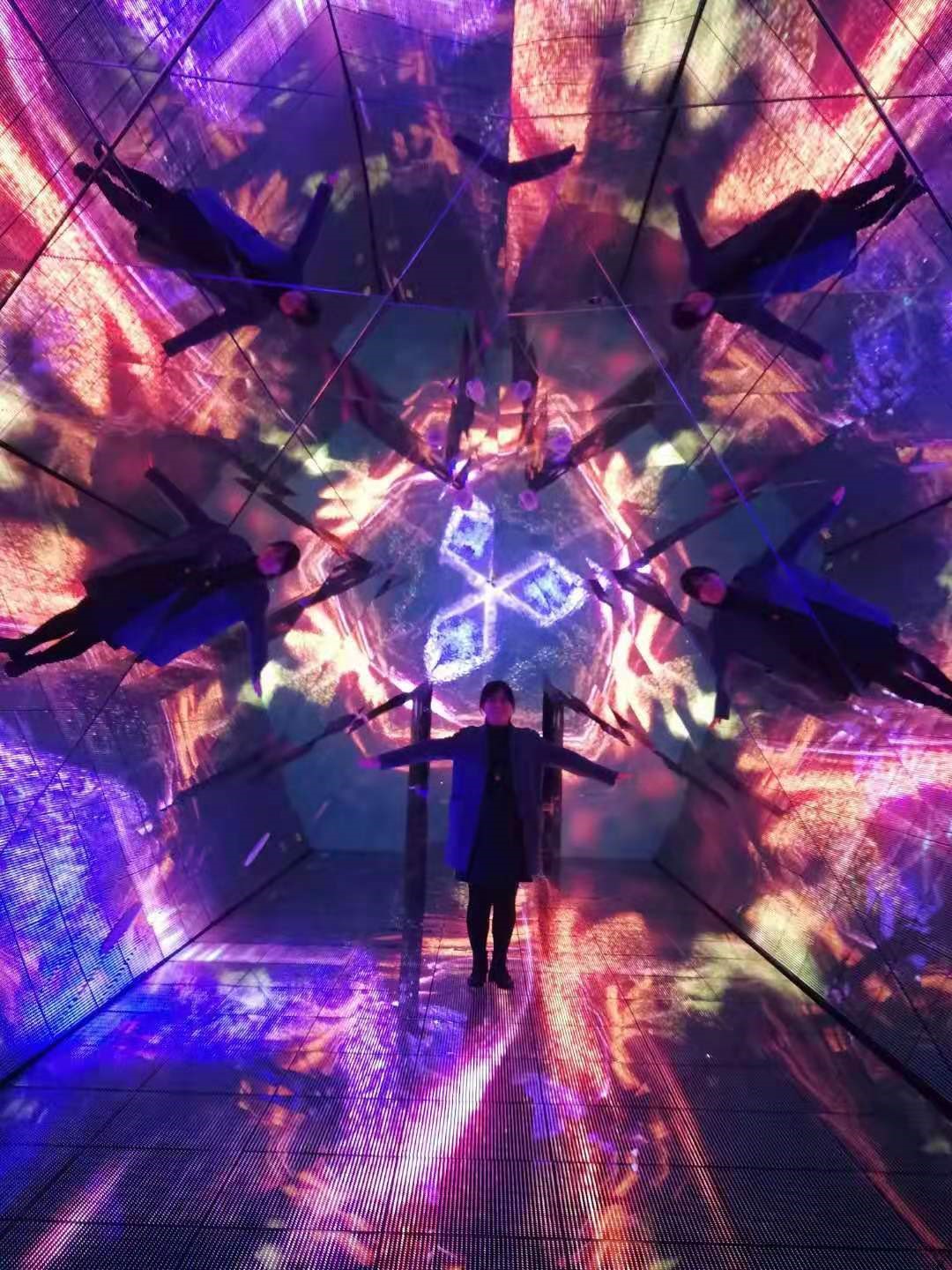 在两个沉浸式的展厅之后,是夜光场景区域,一幅独角兽站在星空中的夜光画,令人感觉既魔幻又宁静,像是踏入了梦中的世界。随后的万花幻境让大家感觉站在了一个巨型的万花筒中,镜像的世界加上时刻变幻的图案和色彩,让大家拍下的每一张照片都是惊喜。