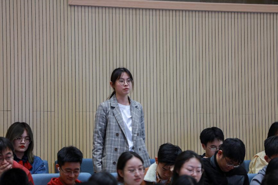 闫超教授首先总结了毛主席诗词的四个创作特点,意境上雄奇瑰丽、气势恢宏,情感上豪情万丈、壮志凌云,内容上心忧天下、爱国爱民,形式上则体现了现实主义和浪漫主义的完美融合。随后,闫教授结合中国共产党发展和中国革命不同时期的历史,对毛泽东同志诗词创作的背景和心路历程娓娓道来,带领现场观众领略一代伟人的诗人魅力。历数毛主席的诗词作品,从“恰同学少年,风华正茂”到“待到山花烂漫时,她在丛中笑”,观众们在诗句中感受到了毛主席志存高远的爱国情怀、舍家为国的奉献情怀以及愈挫愈勇的执着情怀。看我党在硝烟中不忘初心,为争取民族独立和人民自由幸福而奋斗,共同重温中共党史、体会中国革命的波澜壮阔。分享结束后,到场的师生与闫超教授进行了对话互动。闫超教授表示,读毛泽东诗词能够收获许多感悟,并鼓励青年人能够不忘初心,做到立志、执着、心胸宽广,勇担时代使命,在未来的拼搏中干大事成大事。