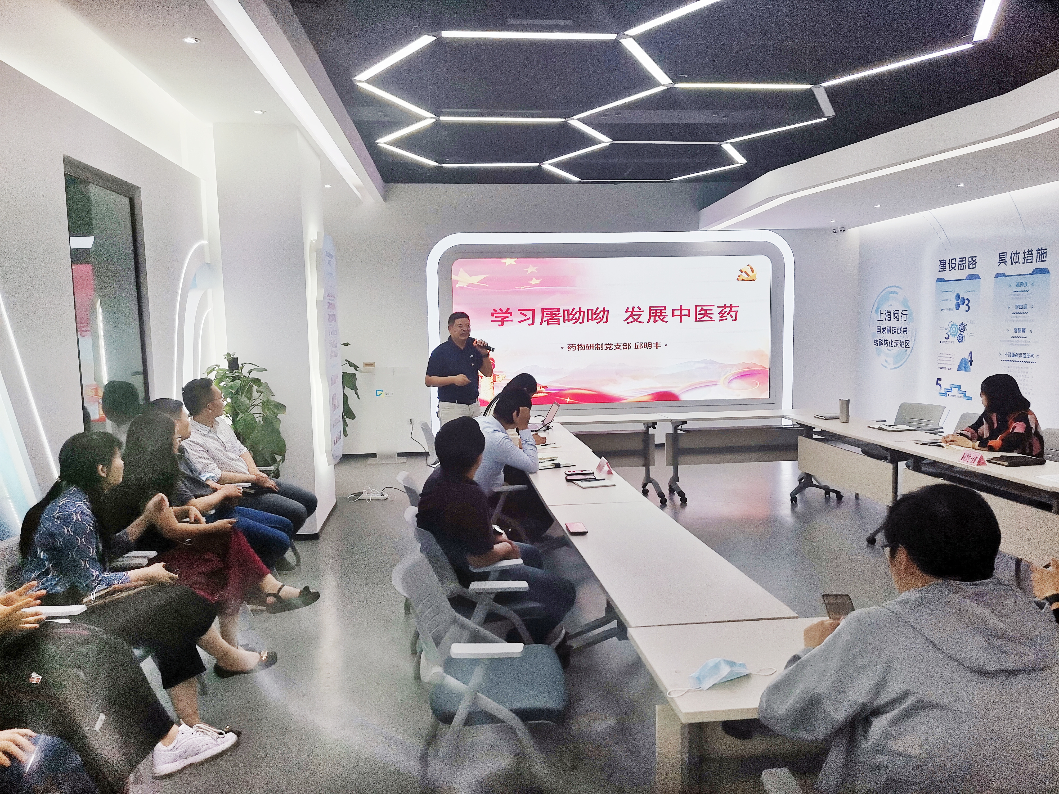 活动在闵行区科创服务中心一楼大厅开展,科协事业单位第一党支部书记杨磊首先解读了闵行区关于推进科技创新创业成果转化政策意见的解读,期待成人视频 成果尽早尽快落地闵行。随后成人视频 药物研制党支部书记邱明丰介绍了支部总体情况,突出介绍了药物研制党支部的学科学术专业科技特色,分享了《学习屠呦呦 发展中医药》微党课,讲述了荣获诺奖、全国优秀党员屠呦呦研究员为战胜三大死亡疾病之一的疟疾,研制青蒿素所经历的艰苦岁月、所闪现的共产党员光芒与精神。最后,四个党支部一起学习了中国共产党的成立、讲述海南琼崖纵队雕塑《艰苦岁月》的党史微电影,并做了建党一百周年党史内心体验的深入交流。