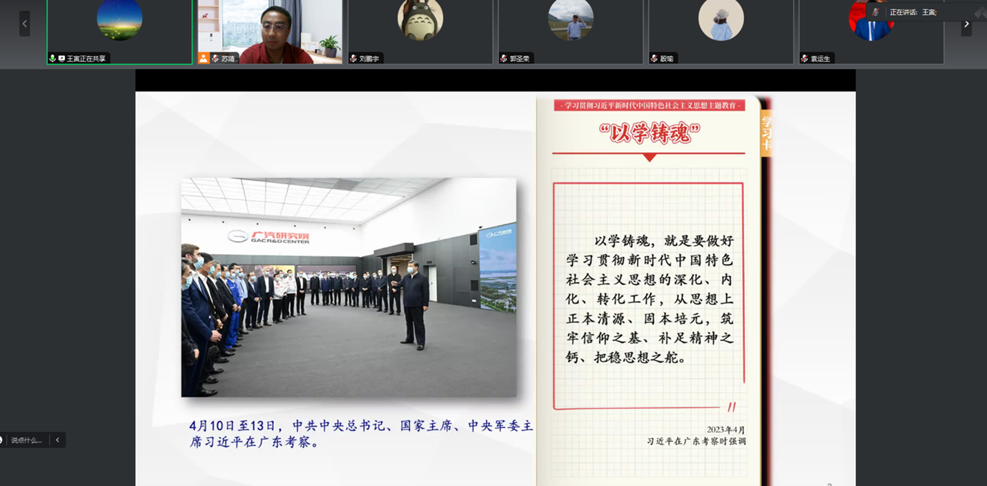 王寅带领支部党员认真学习习近平总书记关于以学铸魂、以学增智、以学正风、以学促干等重要论述。支部全体认真学习了习总书记在广东、陕西、内蒙古和江苏考察的重要讲话和指示。