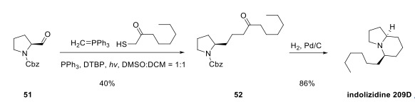 串联反应可以通过一步操作实现多个碳碳键的构建,是一种绿色、高效且经济的方法。自由基型的串联反应的设计和实现一直是非常有趣但非常具有挑战性的工作。孙占奎课题组设计并实现了一种可见光诱导的自由基型“Wittig/氢烷基化”串联反应策略。该成果基于课题组以前的工作(Green Chem., 2020, 22,669)。在可见光诱导下,α-巯基取代的羰基硫醇通过脱硫过程形成烷基自由基(I),之后加成到Wittig反应原位生成的烯烃(Ⅱ)上,从而得到延长碳链的自由基中间体(III),之后经过氢原子转移反应得到产物(4)。该方法具有不含金属、条件温和、底物适用范围广、官能团耐受性好等特点。作者进一步把该方法应用于活性天然产物的合成上,作者以醛(51)为原料,通过此串联反应与氢化两个步骤,以34%的总收率得到了天然产物indolizidine 209D。