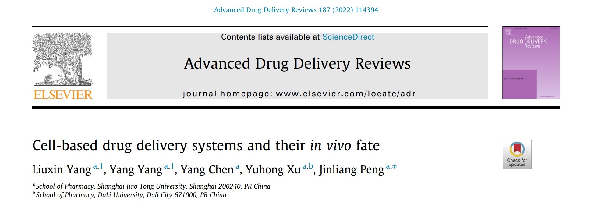 近日,成人视频 彭金良课题组应邀在药学领域权威期刊Advanced Drug Delivery Reviews发表了题为“Cell-based drug delivery systems and their in vivo fate”的综述文章,针对基于细胞的药物递送系统的生物学性质与功能、药物载荷与递送应用,其体内命运及影响因素等进行了系统阐述。