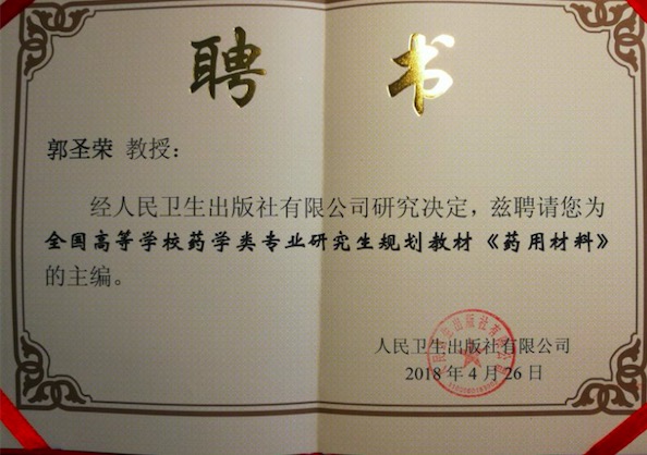 2018年4月26日上午,由人民卫生出版社主办的<全国高等学校药学类专业研究生规划教材主编人会暨学术评审委员会成立会议>在人卫大厦成功举办。成人视频 郭圣荣教授在此次会议上受聘担任全国高等学校药学类专业研究生规划教材学术评审委员会委员和《药用材料》的主编。