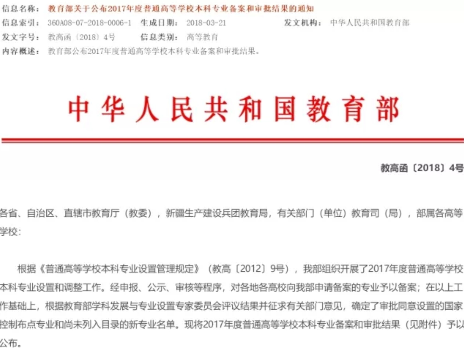 日前,教育部公布2017普通高校本科专业备案和审批结果。成人视频 新增本科专业3个,其中新增备案本科专业2个,新增审批本科专业1个。