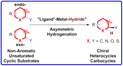手性杂环和碳环结构广泛存在于各种天然产物和药物分子中,在其众多合成方法中,不对称催化氢化 反应是最为高效绿色的合成方法之一并具有很好的工业化应用价值。相比于芳香环状底物,非芳香环状底物具有易得性、多样性和高活性等方面的优势,因此相关研究在近年来备受关注。但是环状结构的刚性特点大大增加了手性控制的难度,降低了高效手性催化剂的开发效率。近年来,张万斌课题组开展了一系列的不对称催化氢化研究,例如利用其课题组开发的联苯膦/噁唑啉-铱配合物催化剂,成功地实现了环外烯烃的高效不对称氢化(如:Adv. Synth. Catal., 2010, 352, 1841; Angew. Chem. Int. Ed., 2013, 52, 2203; 2014, 53, 1901; Chem. Eur. J., 2016, DOI: 10.1002/chem.201604298.)。同时他们在钯催化和铑催化的不对称氢化研究方面也取得了可喜的研究结果(如:Angew. Chem. Int. Ed., 2013, 52, 11632; 2015, 54, 2260; 2016, 55, 8444; Org. Lett., 2015, 17, 5380; 2016, 18, 1290.)。