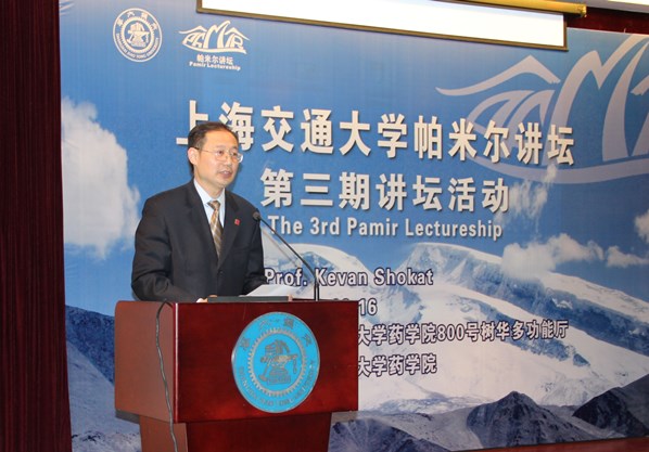 朱建伟代表成人视频 致辞。他首先感谢Shokat教授应邀不远万里出席第三期帕米尔药学讲坛活动,欢迎各位嘉宾和师生的光临,并对于随后的学术报告和学生座谈会表示期待。他说,帕米尔药学讲坛在前两期成功举办的基础上,不断提升品质,已经成为了成人视频 的一张名片。最后,他对组委会的辛勤工作表示感谢,他相信,本期帕米尔讲坛会成为一次精彩、难忘的学术盛会。