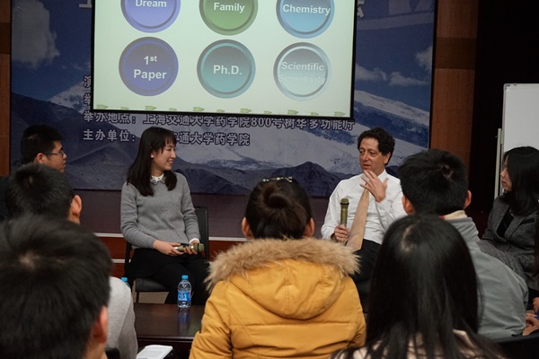 在访谈中,Shokat教授从他的教育经历出发,讲述了他丰富而传奇的求学之路。从最初选择科学道路的初心,到大学时对化学怦然心动;从收获人生中的第一篇论文的喜悦与艰难,到博士、博士后研究中选择实验室和研究方向,Shokat教授从过来人的角度与学生分享了他的看法和感悟。他的经验获得了学生们的共鸣,学生们也被他对科学的坚持和热情所感动。而后,Shokat教授分享了他从事学术研究工作的经验。从建立属于自己的实验室、选择激酶的生物学功能的研究课题,到与第一位研究生、来自中国的Yi Liu艰苦创业;从如何平衡学术与生活,到如何与科研伙伴鼎力合作;教授都娓娓道来,举例详实同时不失幽默。学生们极高评价了教授“志在研发新药”的生涯目标,同时受到了启示和激励。最后,Shokat教授对于生物医药研究、转化医学研究等领域的前景提出了自己的独到见解,他指出了目前的研究热点和未来可能的增长点,开阔了学生的眼界和对生物医药领域研究趋势的认识。