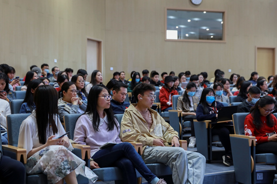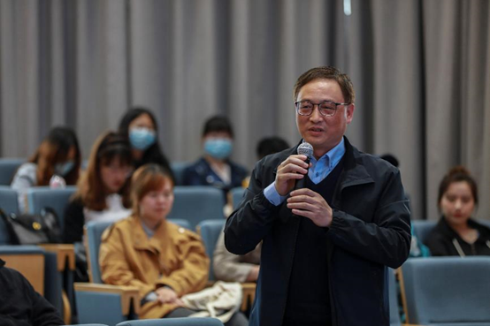闫超教授首先总结了毛主席诗词的四个创作特点,意境上雄奇瑰丽、气势恢宏,情感上豪情万丈、壮志凌云,内容上心忧天下、爱国爱民,形式上则体现了现实主义和浪漫主义的完美融合。随后,闫教授结合中国共产党发展和中国革命不同时期的历史,对毛泽东同志诗词创作的背景和心路历程娓娓道来,带领现场观众领略一代伟人的诗人魅力。历数毛主席的诗词作品,从“恰同学少年,风华正茂”到“待到山花烂漫时,她在丛中笑”,观众们在诗句中感受到了毛主席志存高远的爱国情怀、舍家为国的奉献情怀以及愈挫愈勇的执着情怀。看我党在硝烟中不忘初心,为争取民族独立和人民自由幸福而奋斗,共同重温中共党史、体会中国革命的波澜壮阔。分享结束后,到场的师生与闫超教授进行了对话互动。闫超教授表示,读毛泽东诗词能够收获许多感悟,并鼓励青年人能够不忘初心,做到立志、执着、心胸宽广,勇担时代使命,在未来的拼搏中干大事成大事。