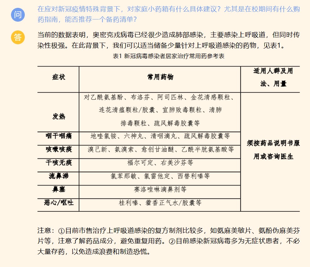 上海市第一人民医院临床药学科主任范国荣团队、胸科医院药剂科主任焦正、仁济医院药学部主任林厚文团队、上海儿童医学中心(国家儿童医学中心)药物临床试验机构副主任高建四位导师结合不同症状给出了对症药物,提供了详细的备药清单,针对不同药物之间的搭配与禁忌给出建议,解答药物的具体疗效和副作用,深入浅出地为广大师生科普了用药安全。