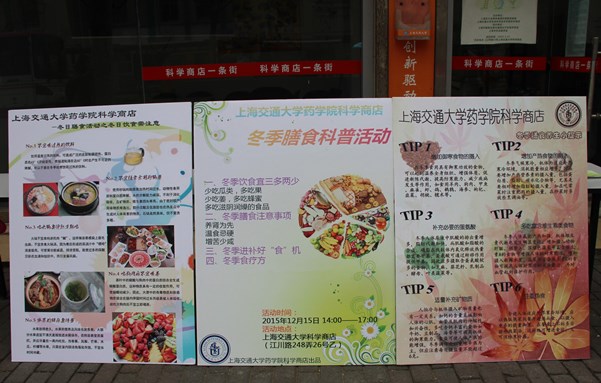 进入冬季以来,气温骤降,天寒地冻,很多人往往只注重了外在的保暖防寒,却忽视了通过膳食保养的重要性,而冬季正是通过食疗调养身体增强体质的好“食”机。为了让更多的人了解和注重冬季膳食养生,成人视频 科学商店的志愿者们将所学的医药养生知识学以致用,于12月15日14:00在科学商店一条街举办了此次冬季膳食科普活动,向附近的市民朋友义务宣传冬季膳食健康知识,获得了广大市民的一致好评。