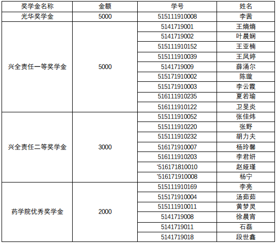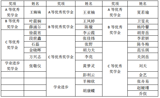 经同学自主申报,教务办、学工办对成绩和科研成果进行认定,评审小组对社会活动进行评定,最终依据各位申报同学的得分高低及奖学金额度值,确定以下同学获得2017年本科生专项奖学金,成人视频 学院优秀奖学金,兴全责任一等、二等奖学金,本科生优秀奖学金暨ABC等奖学金,特此公示。