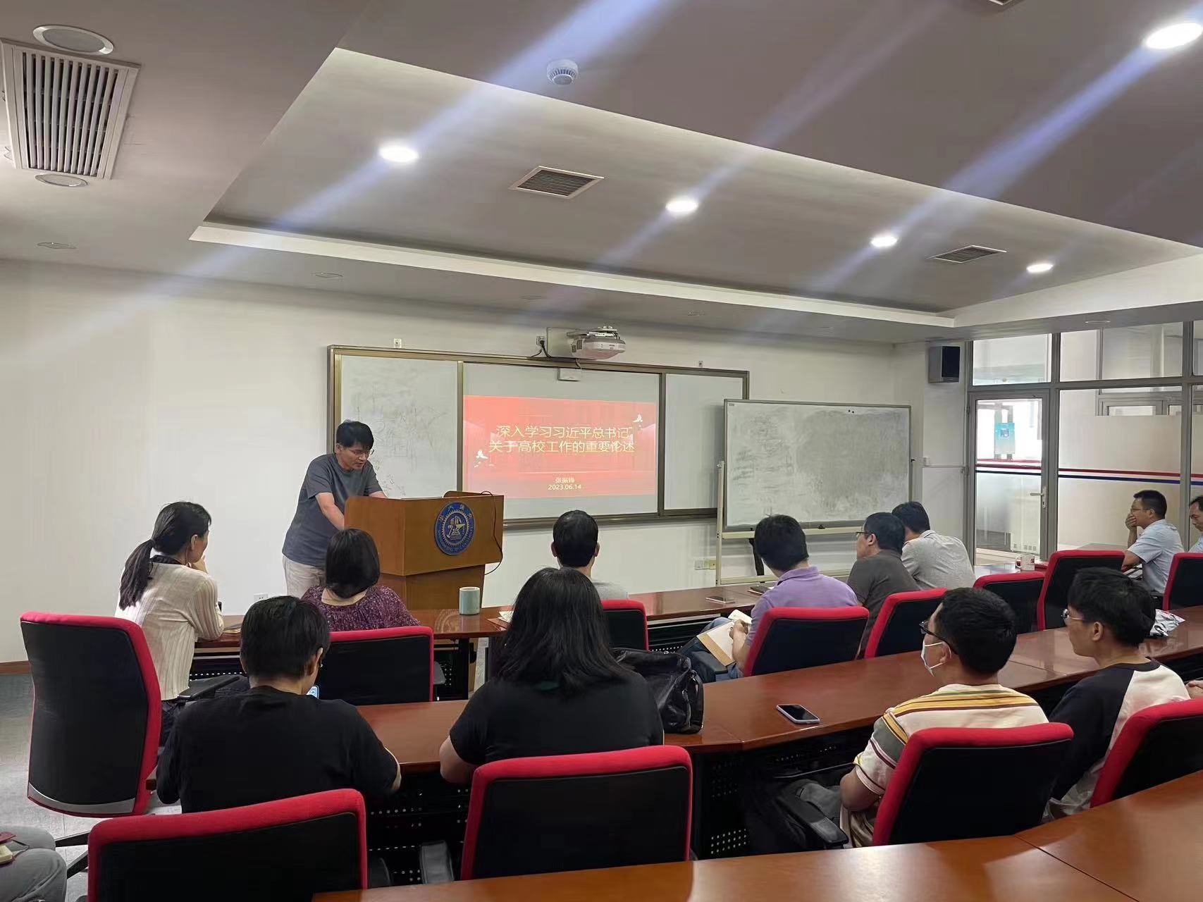 张振锋带领大家系统学习“深入学习习近平总书记关于高校工作的重要论述”的相关材料,对党的十八大以来高校工作所取得的历史性成就以及习近平总书记关于高校工作重要论述的主要内容和重大意义进行了详细介绍。